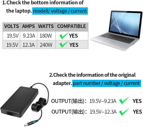 - Sortie:19.5V 12,3A 240W MA (Compatible avec 180W 150W 130W); Taille du connecteur: 7.4mm 5.0mm. Conçu spécifiquement pour (chargeur d'ordinateur portable), ce produit a répondu avec succès à des exigences strictes. Chacun de ses composants est rigoureusement testé par des ingénieurs qualifiés pour garantir la compatibilité et la fiabilité avec votre ordinateur portable. Si, pour une raison quelconque, vous n'êtes pas satisfait dans les 30 jours suivant l'achat de ce chargeur, vous pouvez bénéficier d'un remboursement complet ou d'un remplacement. Il existe également une garantie de 12 mois et un service client dédié est à votre disposition pour vous aider.